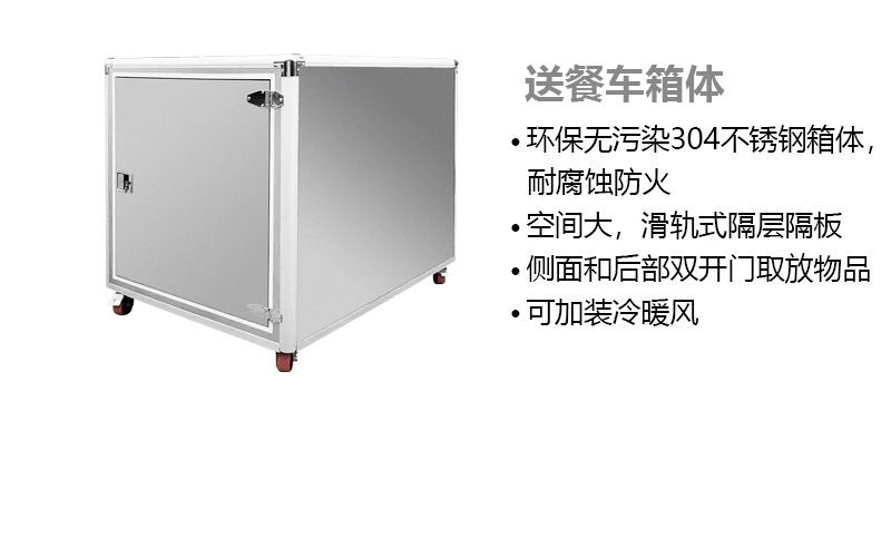 送餐車箱體特點(diǎn):箱體材料采用環(huán)保無污染 304不銹鋼材料,具有耐腐蝕防火特點(diǎn)??臻g大,滑軌式隔層隔板。 側(cè)面和后部雙開門方便用戶取放物品??杉友b冷暖風(fēng)。