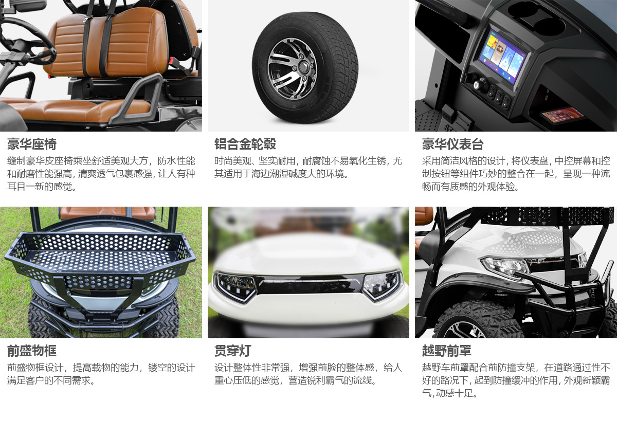 配備大功率電機和大容量電池,采用鋁合金大尺寸越野輪胎, 四輪液壓碟剎+電子駐車。車輛底盤高、動力足、安全性高,具備非同一般的駕乘感。 廣泛應用于高爾夫社區(qū)、郊野、休閑度假酒店、大型農場工作。