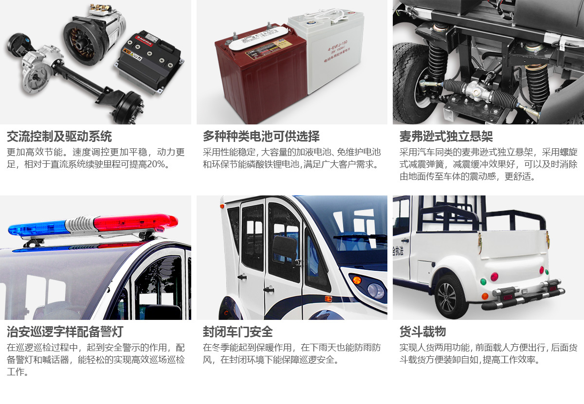 電動(dòng)巡邏車注重實(shí)用性,集警燈、喊話器等警務(wù)系統(tǒng)于一體。